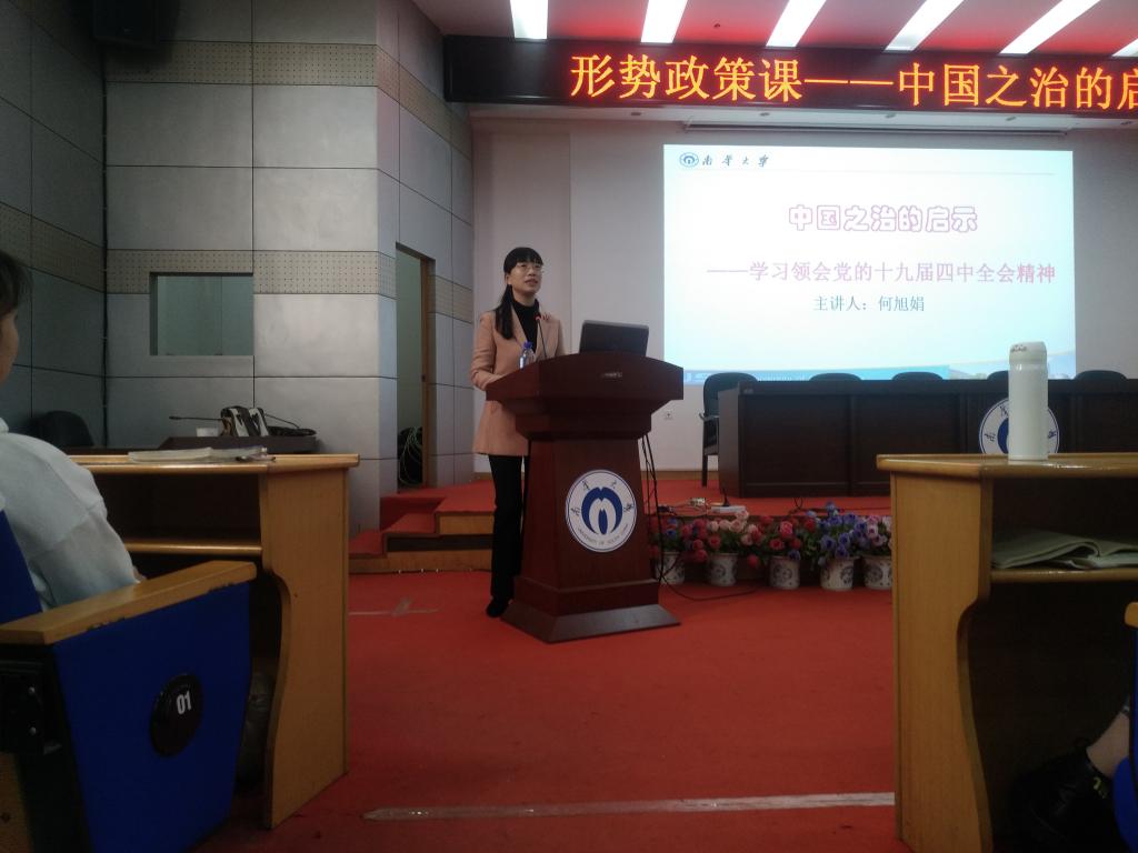 12月13日下午,校党委委员、副校长何旭娟老师以《“中国之治”的启示—学习领会十九届四中全会精神》为题,在红湘校区图书馆学术报告厅为英国365集团2017级学生上了一堂精彩的《形势与政策》课。