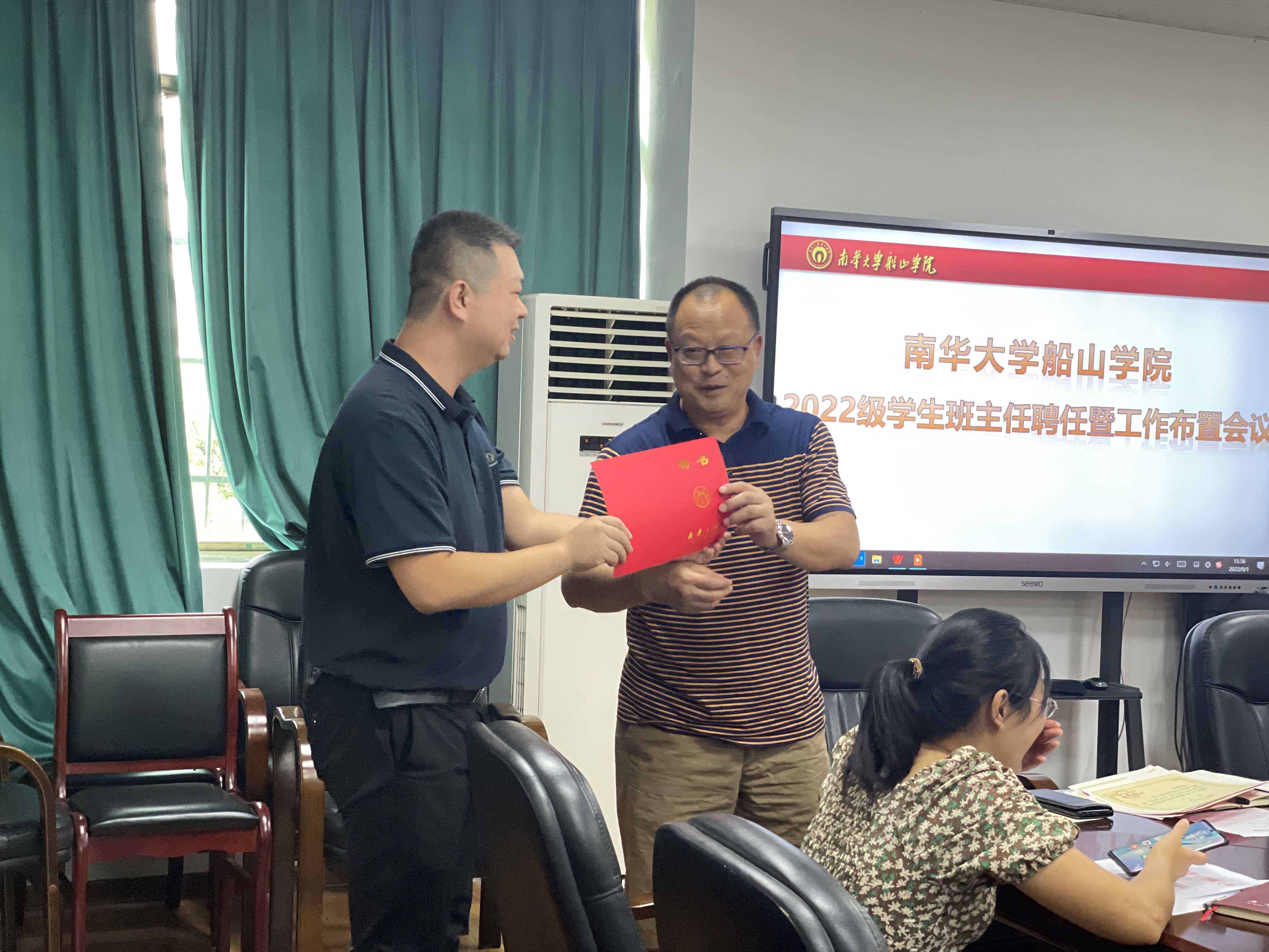 会上,周英老师宣读《关于聘任廖迎春等18位同志为英国365集团2022级学生班主任的通知》。英国365集团院长曾庆生给2022级18位班主任颁发了聘书。 2022级学工室主任旷思佳老师就近期班主任主要工作进行了安排。