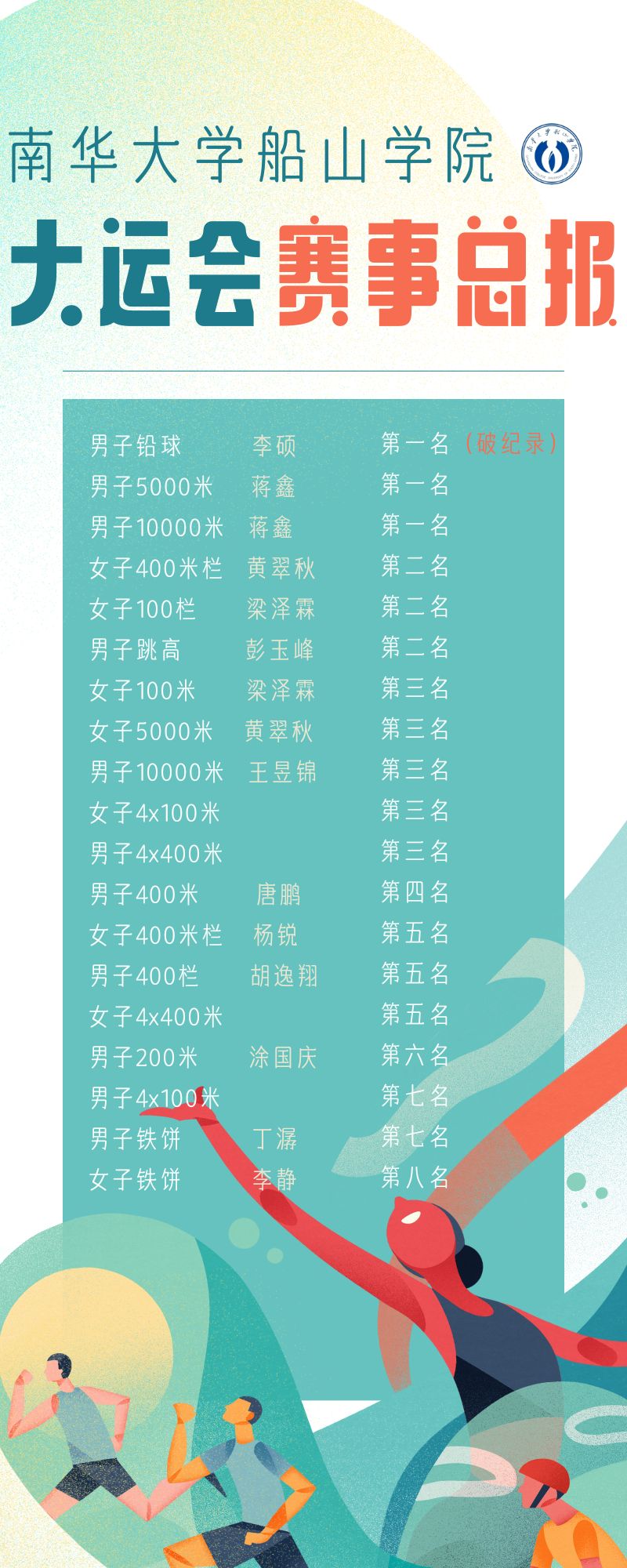 在此次运动会中,船山学子在阳光下接受韧性,速度和力量的挑战,让体能和意志在汗水中中争锋,奔跑,投掷,跳跃,为我院夺的一个又一个耀眼的成绩,他们的团结拼搏精神值得全体同学们学习和发扬。