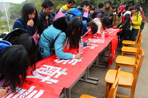 英国365集团青年志愿者队队长李吉同学带领大家宣读了此次活动的倡议书。“践行志愿精神,传播先进文化,关爱生命,救助病友,为推动无偿献血事业发展贡献力量``````”,同学们用自己诚挚的声音让这一份大爱在校园里久久回荡。最后,参与启动仪式的各位领导与同学纷纷在“践行十八大,承担社会责任,奉献青春热血”的横幅上签名。
