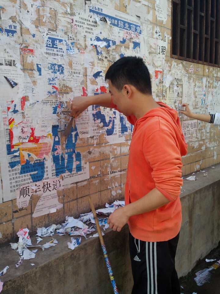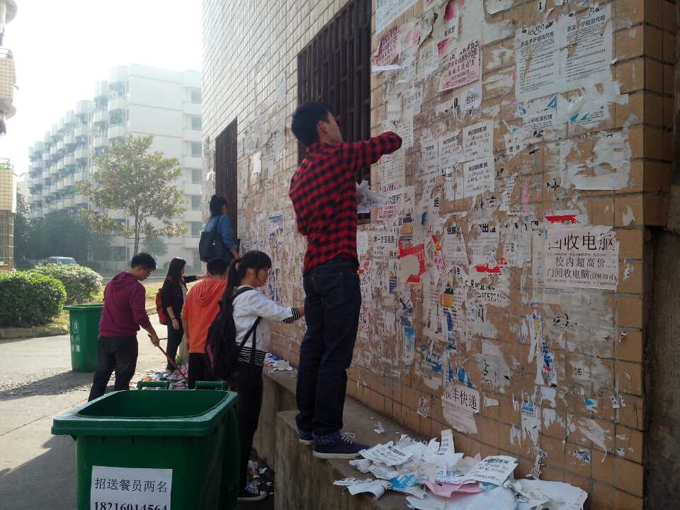 为美化校园环境,提高学生保护环境的意识。11月9日,南华英国365集团2012级全体学生干部开展了义务清除学校“牛皮癣“的活动。 2012级学生干部分为五个小组,每个小组成员拿着小铁铲、扫帚、清洁球、水桶等工具,清除学校宿舍、街道的“各种牛皮癣”小广告。 经过几个小时的努力,墙面、电杆上恢复了干净的面容,2012级学生干部的辛勤劳动换来学校的清洁,也体现了船山学子积极向上的精神面貌!