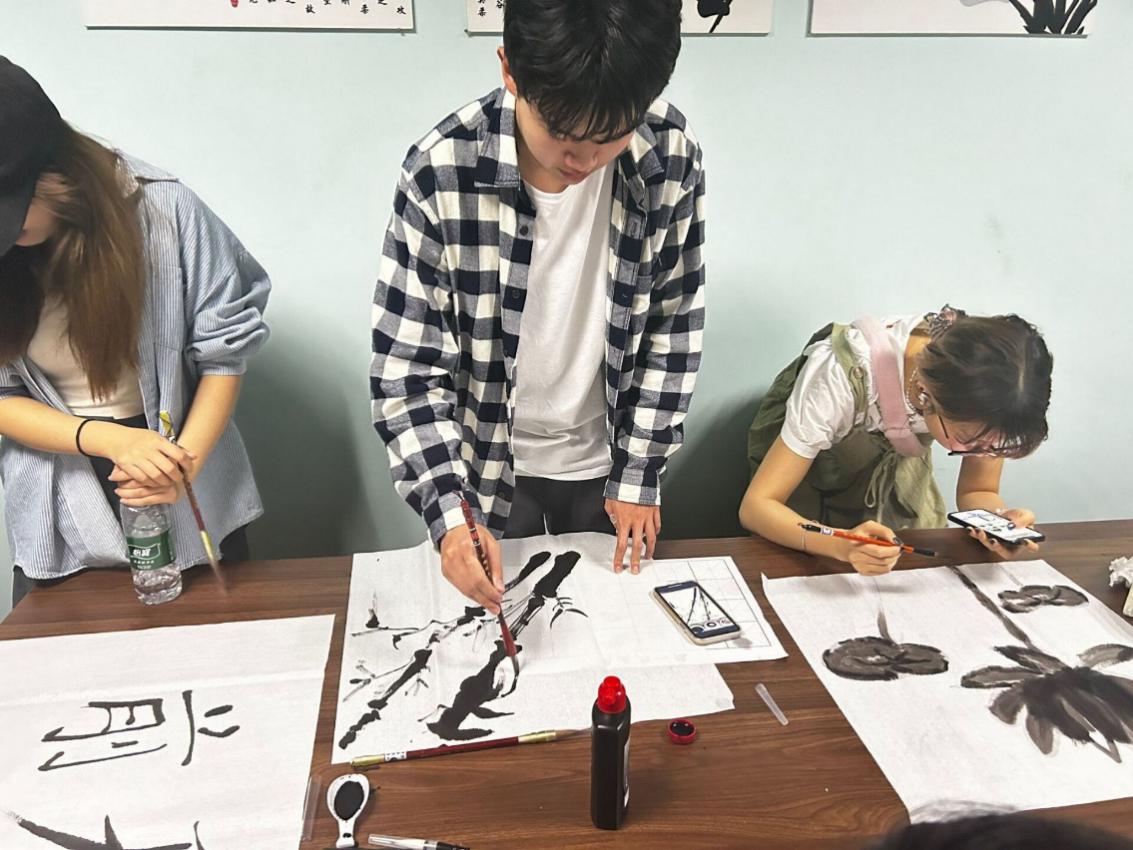 同学们在聚精会神的进行国画、书法创作
