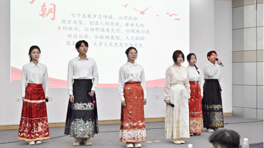 接下来是由药学院与核科学与技术学院带来的《祖国啊,我亲爱的祖国》、《巾帼颂》、《归国》。“平凡中蕴藏伟大巾帼英豪,明媚的春天里,生机盎然,柔情里满是激昂”巾帼英雄不让须眉,她们在不同时代,用自己的力量展示着女性的力量。“我是新刷出的雪白的起跑线,是绯红的黎明正在喷薄,祖国”“我回来了,我回来了,我的祖国”每一句诗词中都彰显着华夏儿女心中荡漾着的对祖国深沉的热爱。