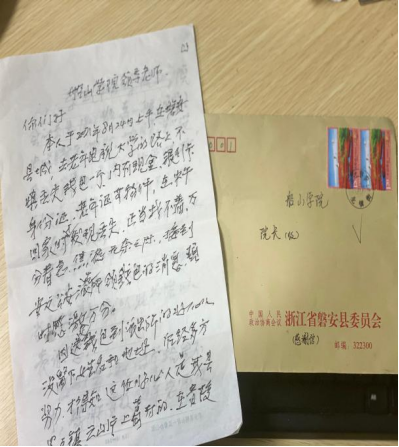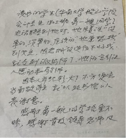 令葛一航感到意外的是,自己小小的举动,却让素未谋面的老亲自向学校写了一封感谢信,对葛一航同学拾金不昧的行为高度赞扬。老人的字迹不是很清晰,但却写了满满两大版,字里行间都透露着她最真挚的感谢。这不仅是对葛一航找回自己失物的感谢,更是对学校能培养出这种优秀品格的学生表示由衷的认可。